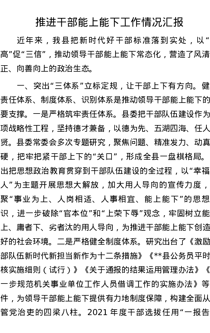 推进干部能上能下工作情况汇报