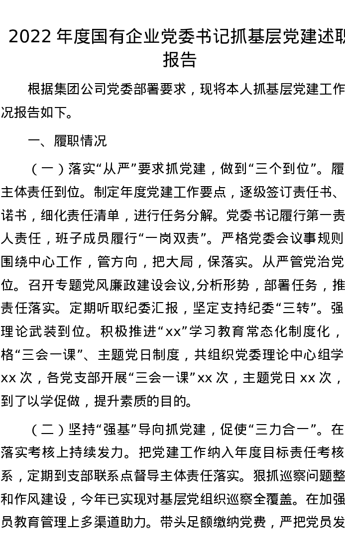 2022年度国有企业党委书记抓基层党建述职报告