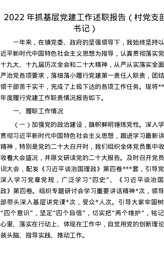 2022年抓基层党建工作述职报告(村党支部书记)