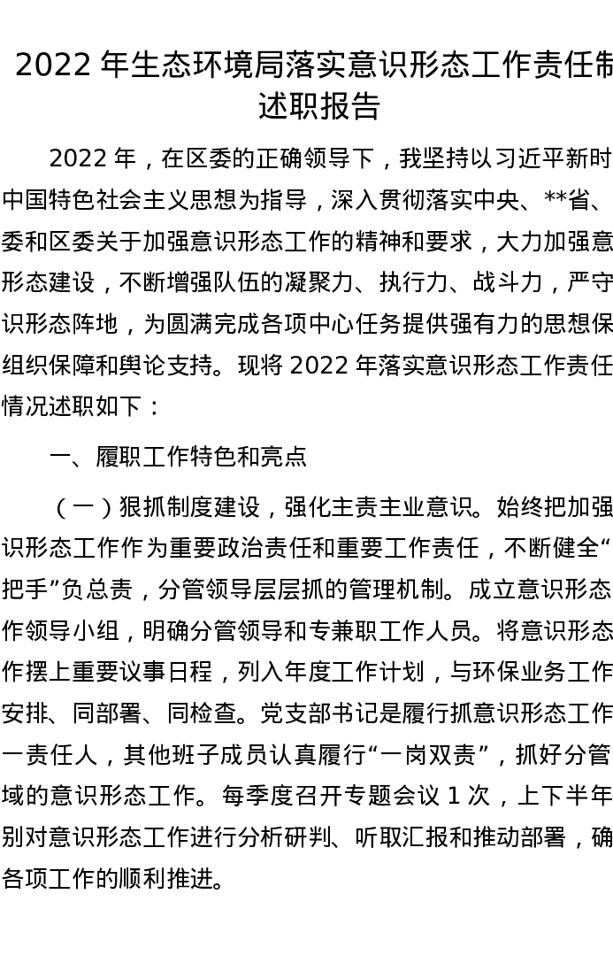 2022年生态环境局落实意识形态工作责任制述职报告