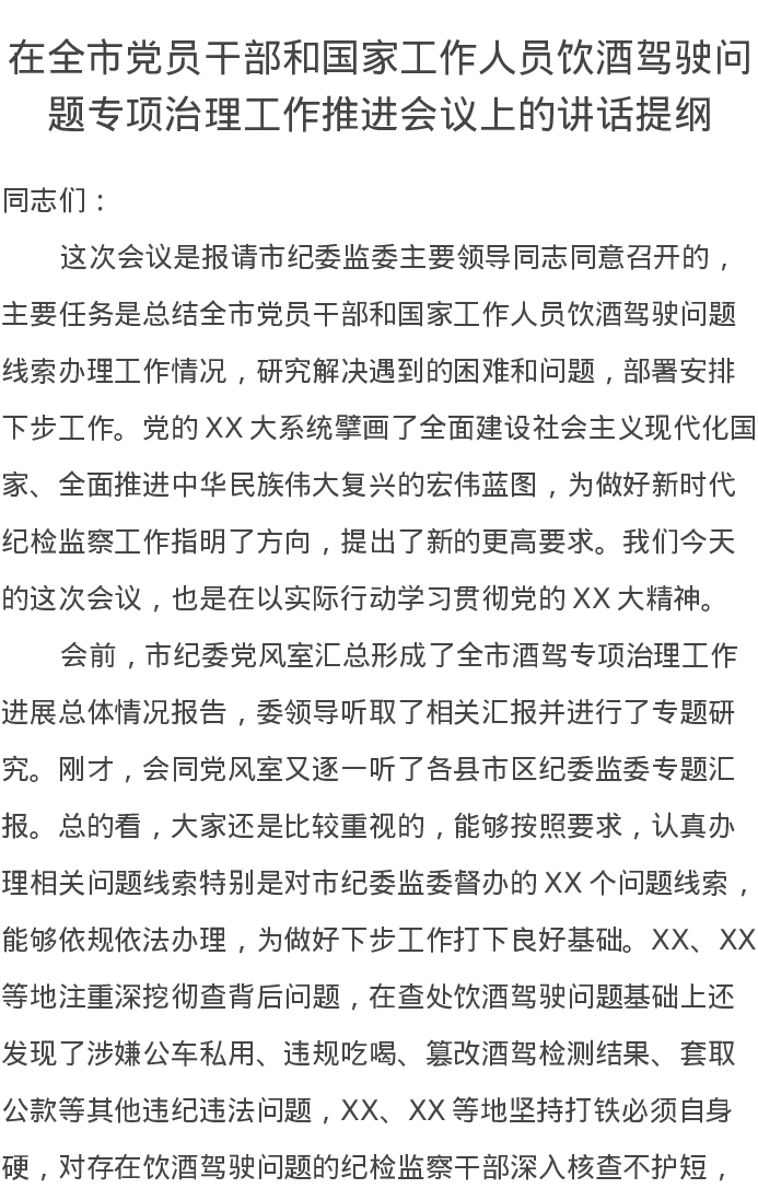 在全市党员干部和国家工作人员饮酒驾驶问题专项治理工作推进会议上的讲话提纲