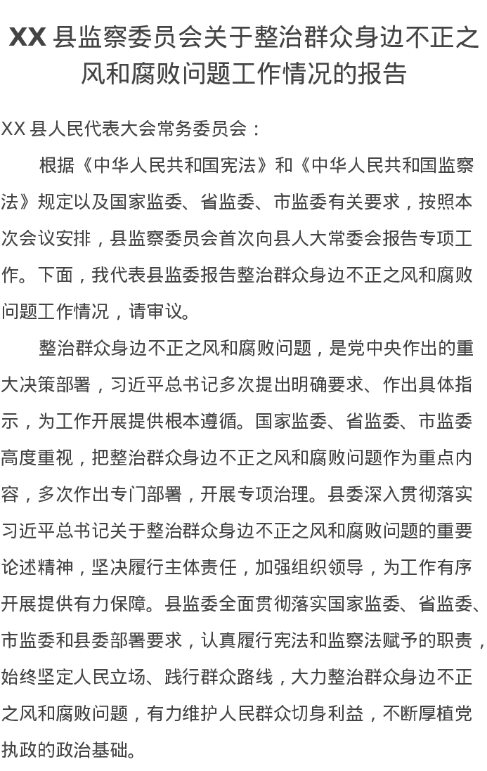 XX县监察委员会关于整治群众身边不正之风和腐败问题工作情况的报告