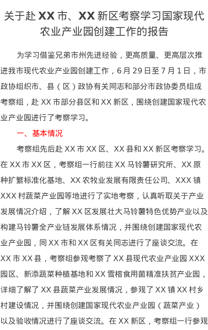 关于赴XX市、XX新区考察学习国家现代农业产业园创建工作的报告