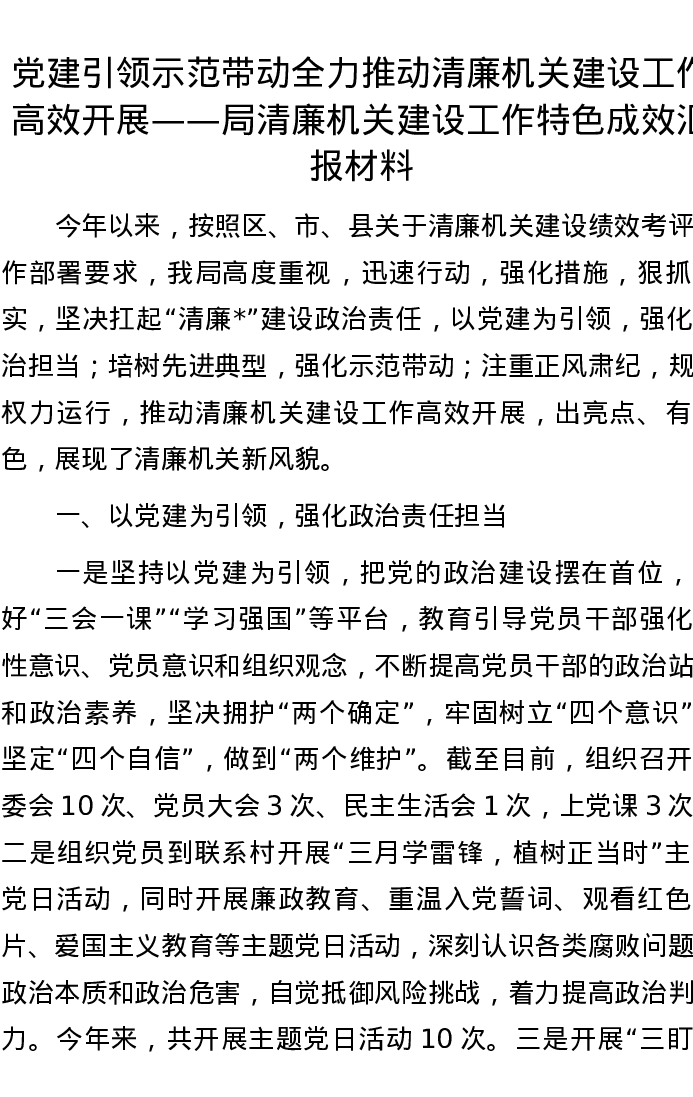 党建引领 示范带动 全力推动清廉机关建设工作高效开展——局清廉机关建设工作特色成效汇报材料