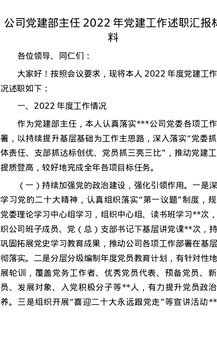 公司党建部主任2022年党建工作述职汇报材料