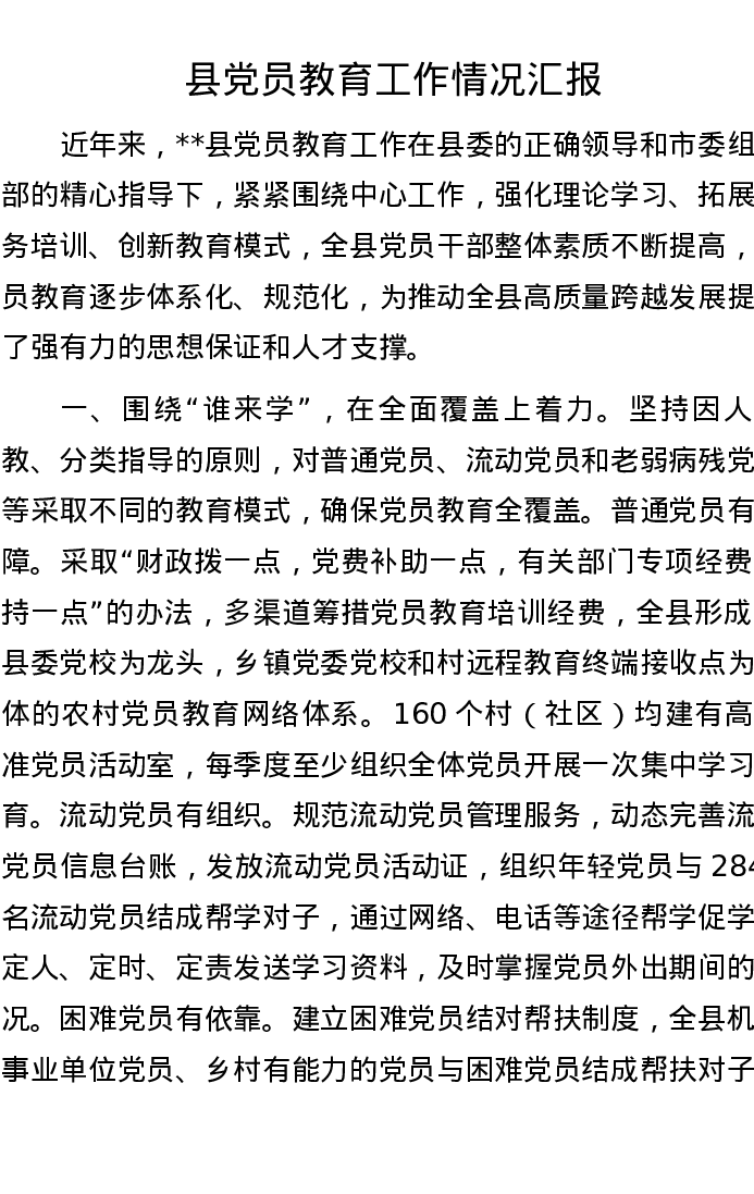 县党员教育工作情况汇报