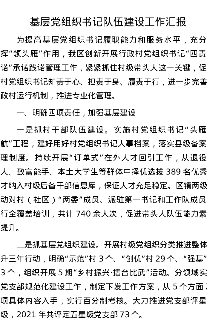 基层党组织书记队伍建设工作汇报