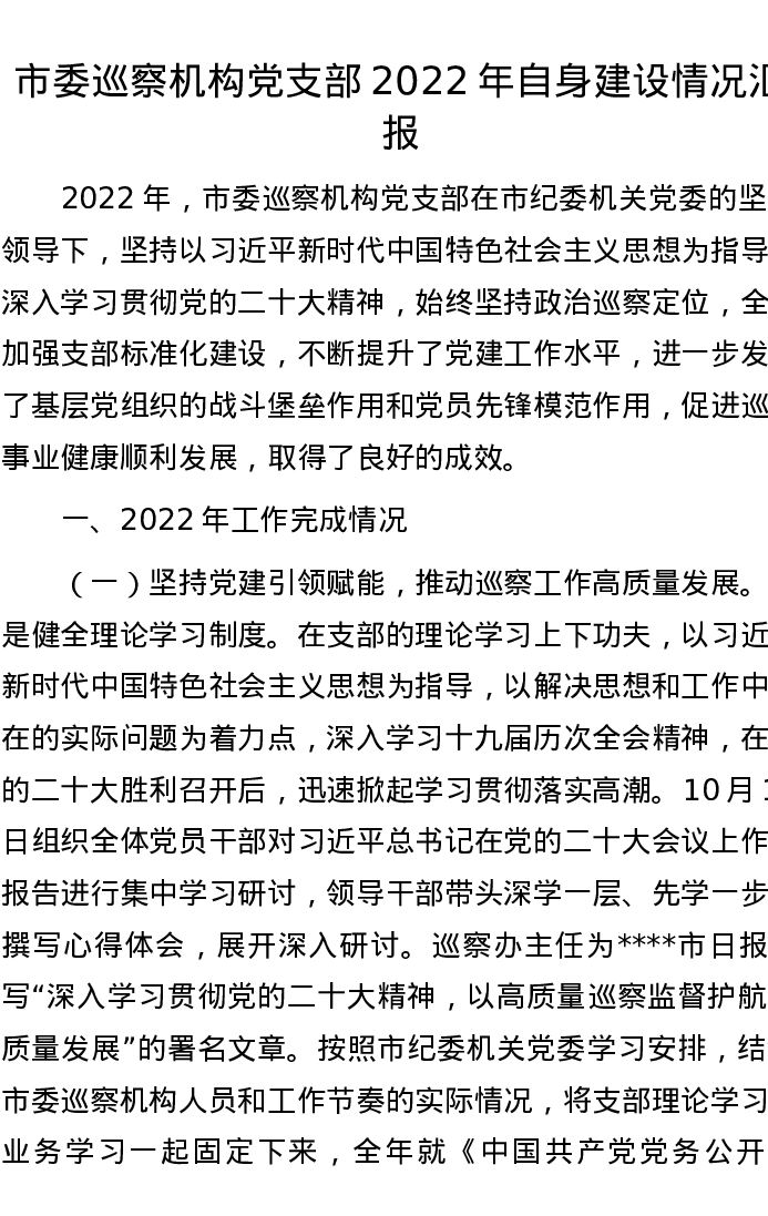 市委巡察机构党支部2022年自身建设情况汇报