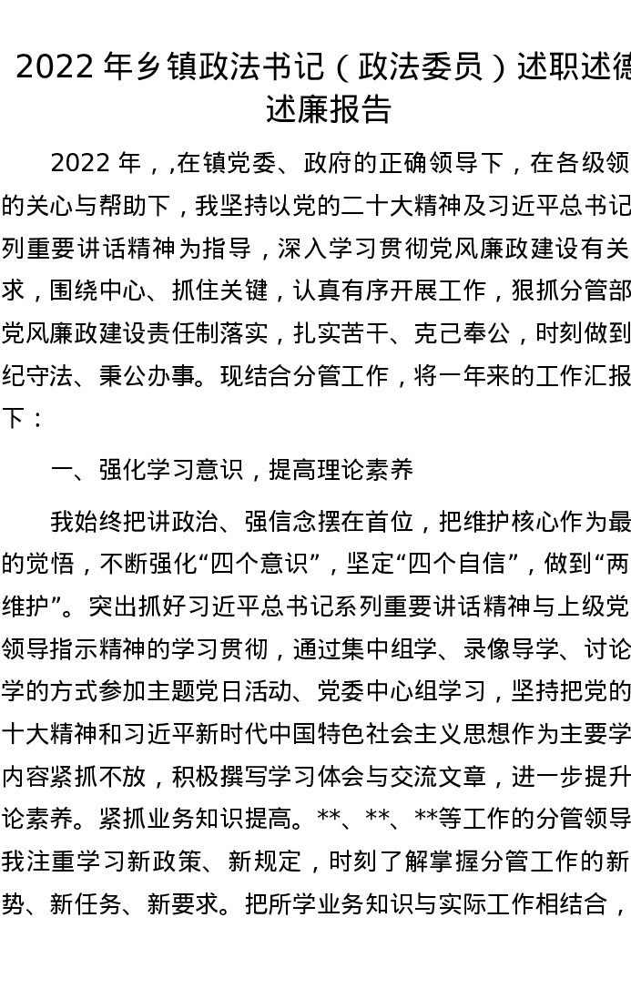 2022年乡镇政法书记(政法委员)述职述德述廉报告