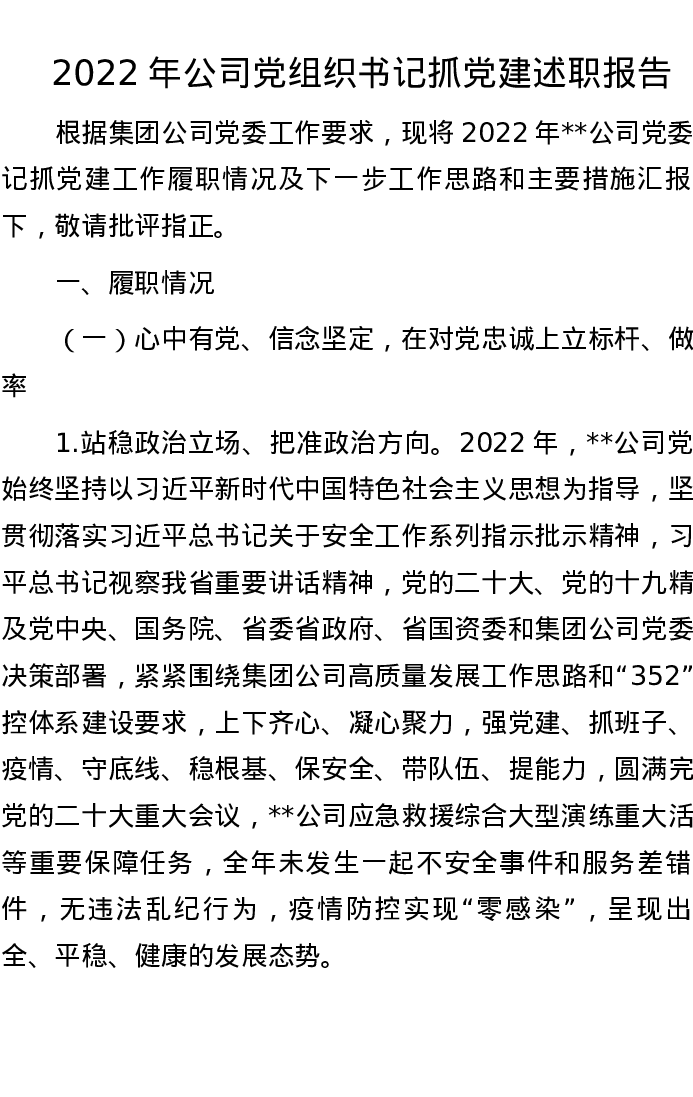 2022年公司党组织书记抓党建述职报告
