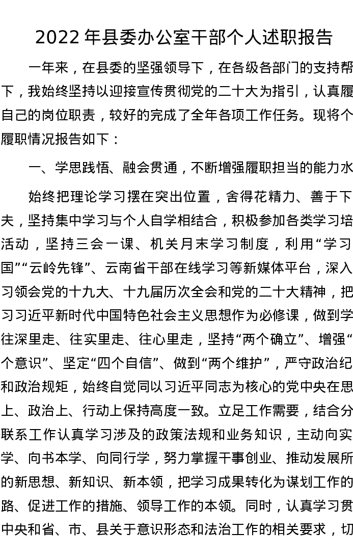 2022年县委办公室干部个人述职报告