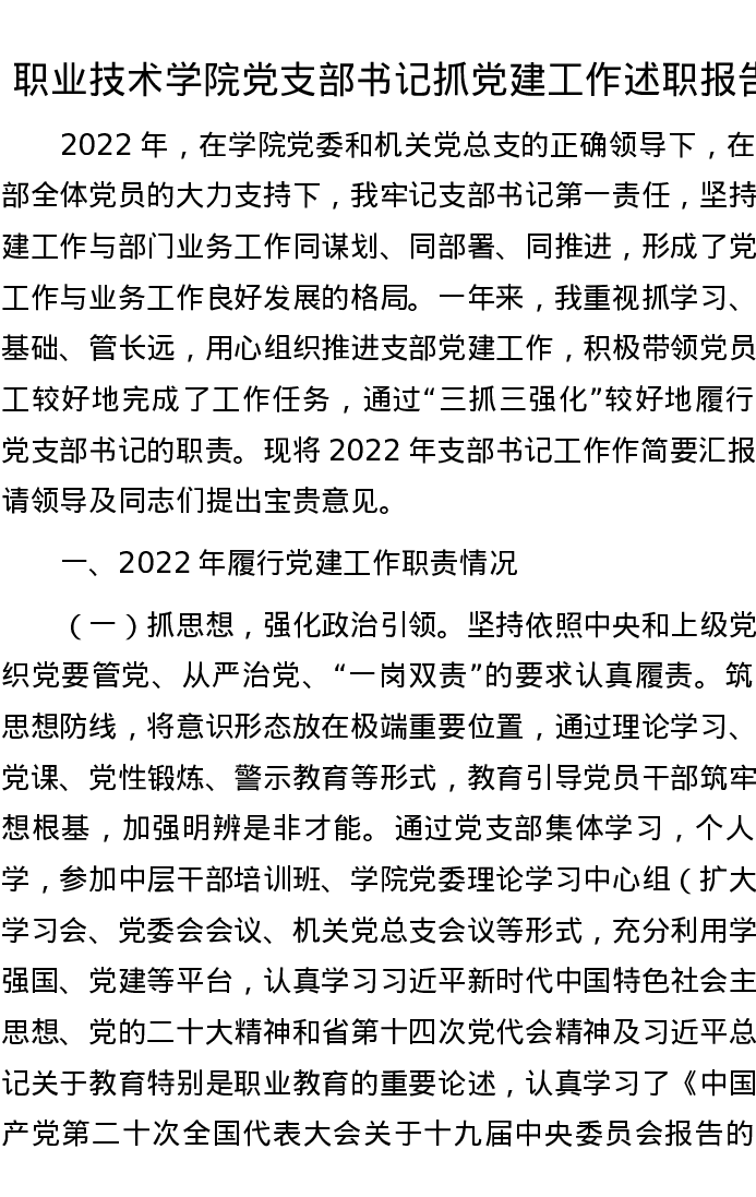 职业技术学院党支部书记抓党建工作述职报告