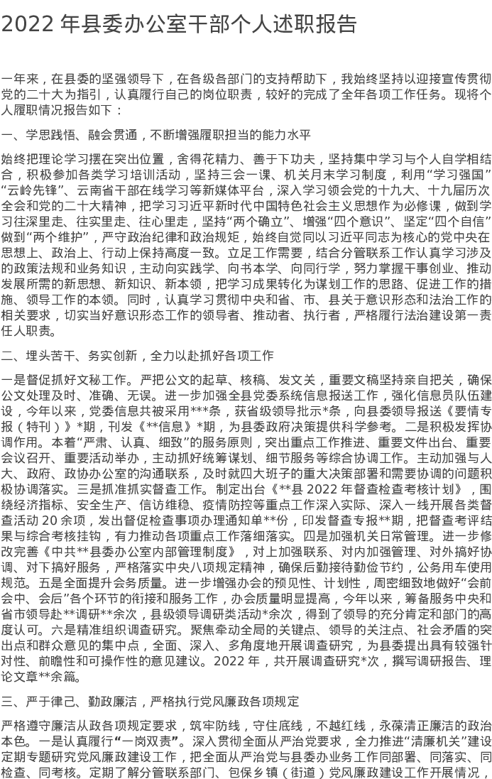 2022年县委办公室干部个人述职报告