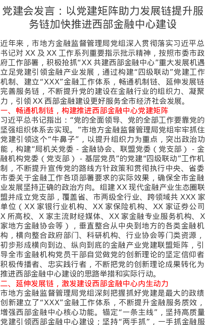 党建会发言:以党建矩阵助力发展链提升服务链加快推进西部金融中心建设