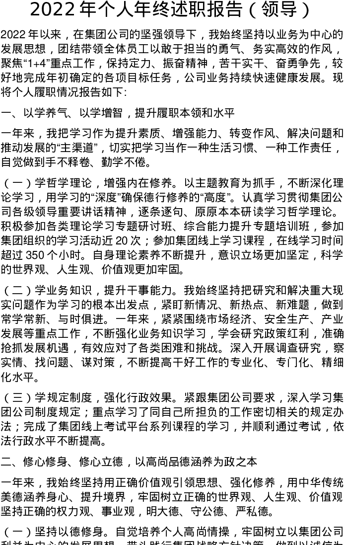 2022年个人年终述职报告(领导)