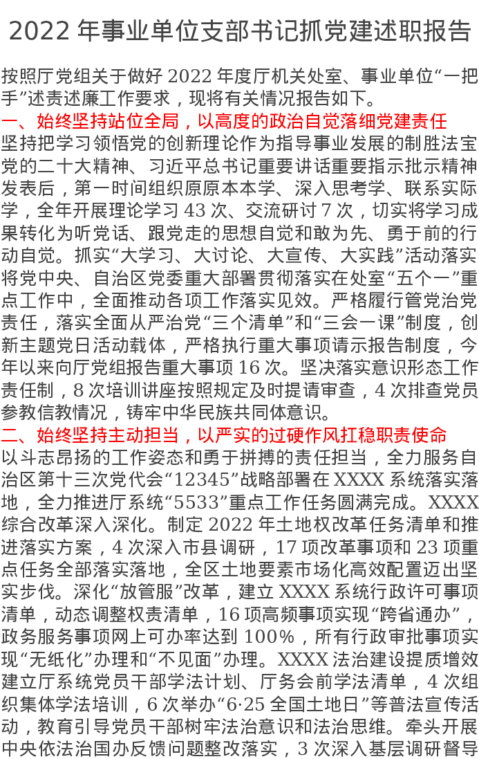 2022年事业单位支部书记抓党建述职报告