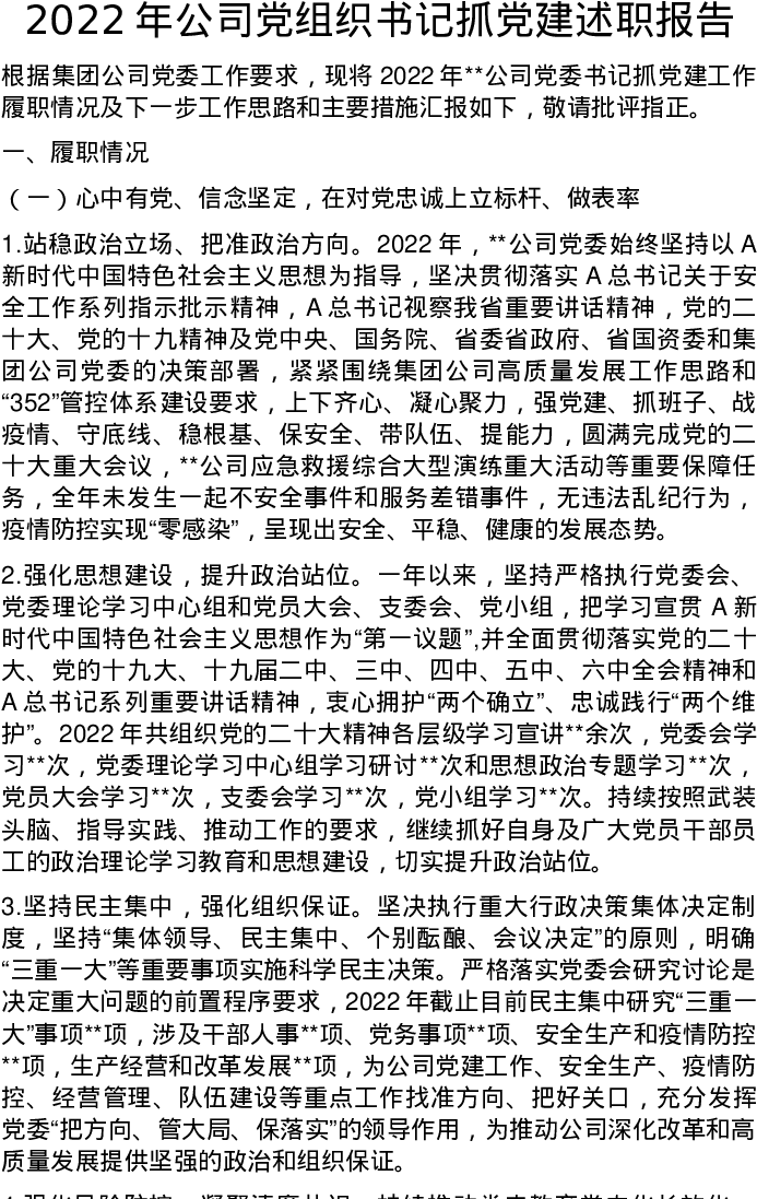2022年公司党组织书记抓党建述职报告