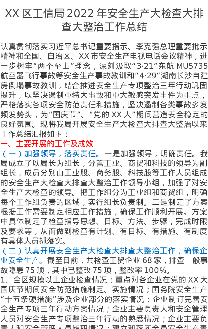 XX区工信局2022年安全生产大检查大排查大整治工作总结