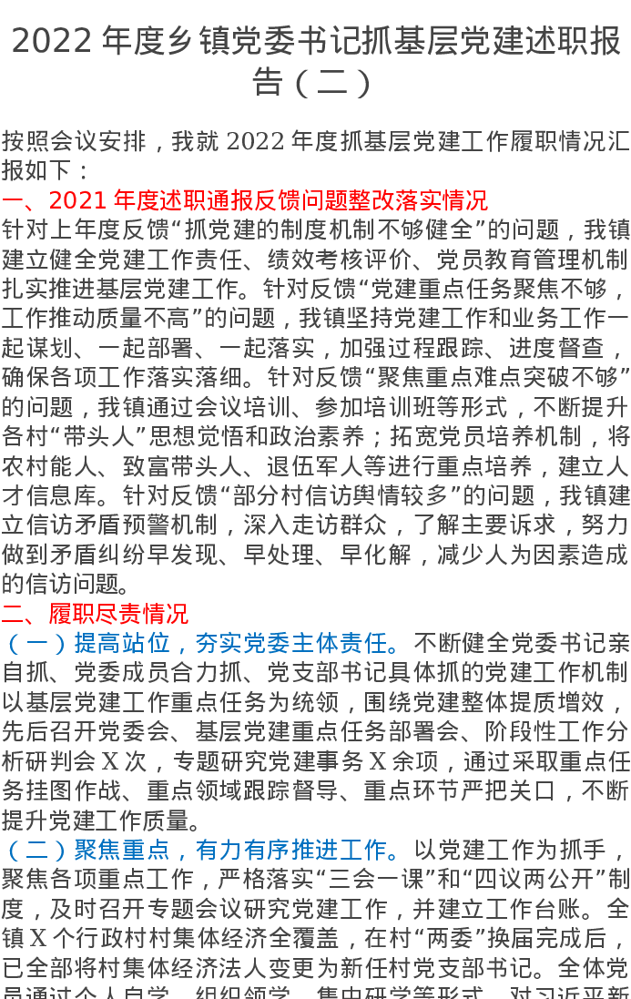 2022年度乡镇党委书记抓基层党建述职报告(二)