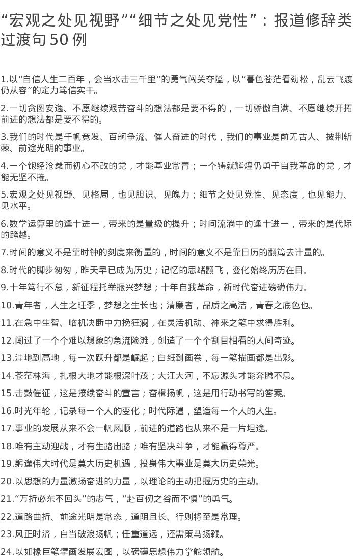 “宏观之处见视野”“细节之处见党性”:报道修辞类过渡句50例