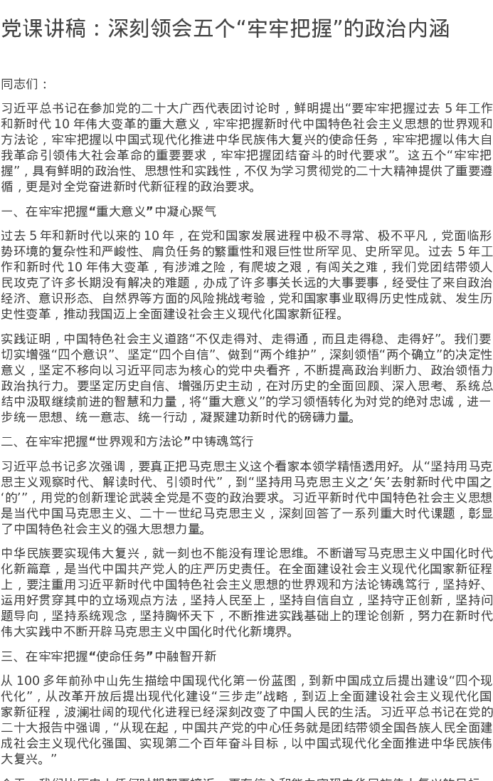 党课讲稿:深刻领会五个“牢牢把握”的政治内涵