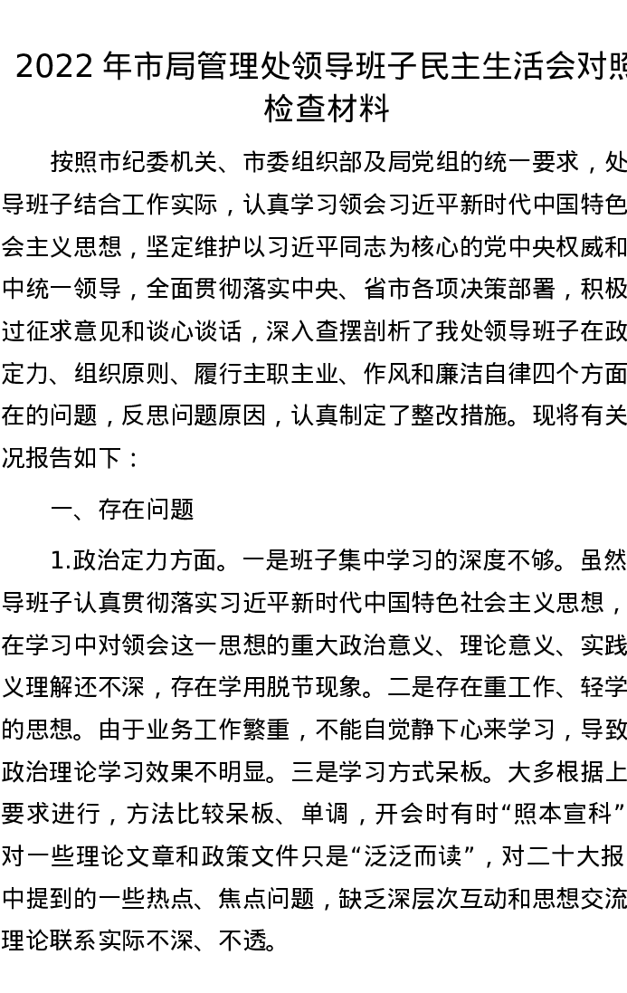 2022年市局管理处领导班子民主生活会对照检查材料