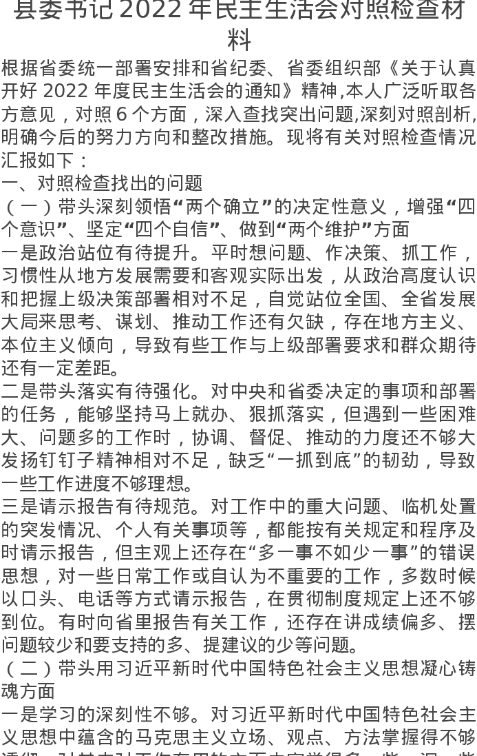 2022年县委书记民主生活会对照检查材料
