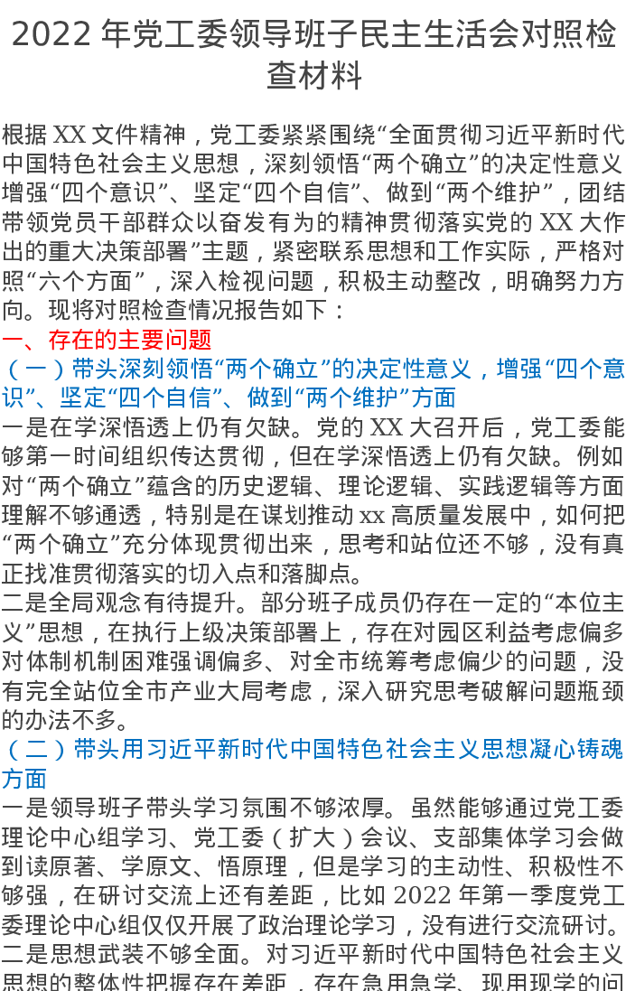 2022年党工委领导班子民主生活会对照检查材料(六个带头方面)