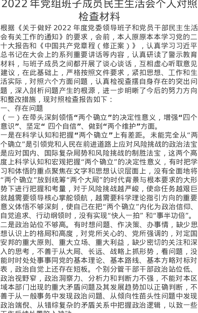 2022年党组班子成员民主生活会个人对照检查材料(六个带头方面)