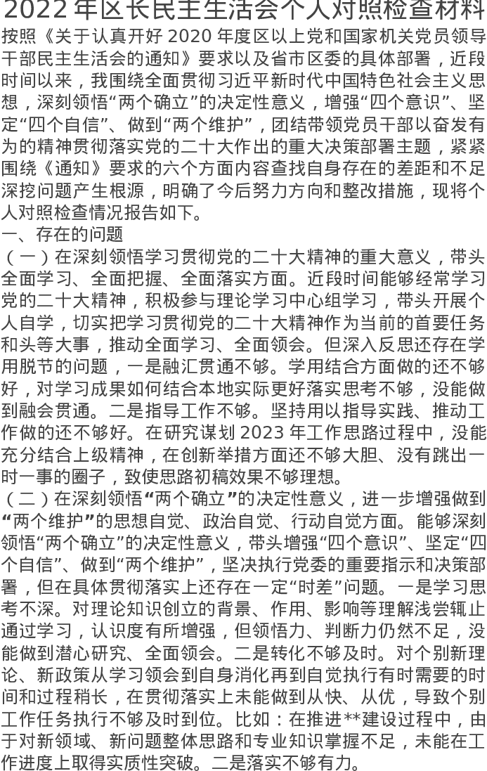 2022年区长民主生活会个人对照检查材料(六个带头方面)