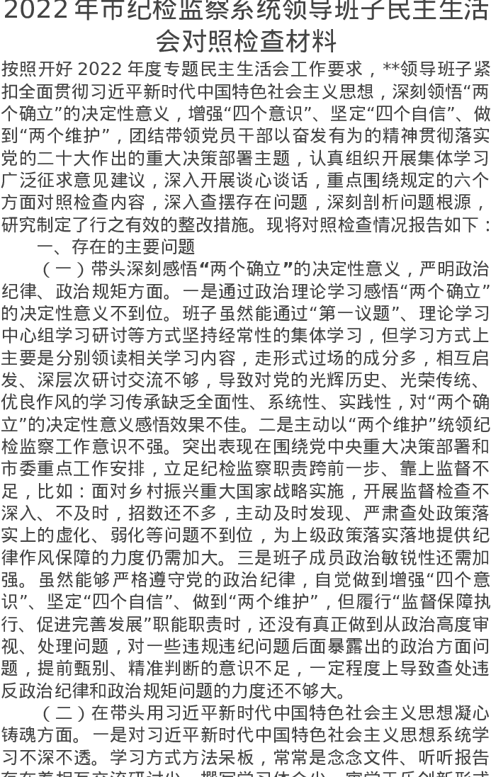 2022年市纪检监察系统领导班子民主生活会对照检查材料(六个带头方面)