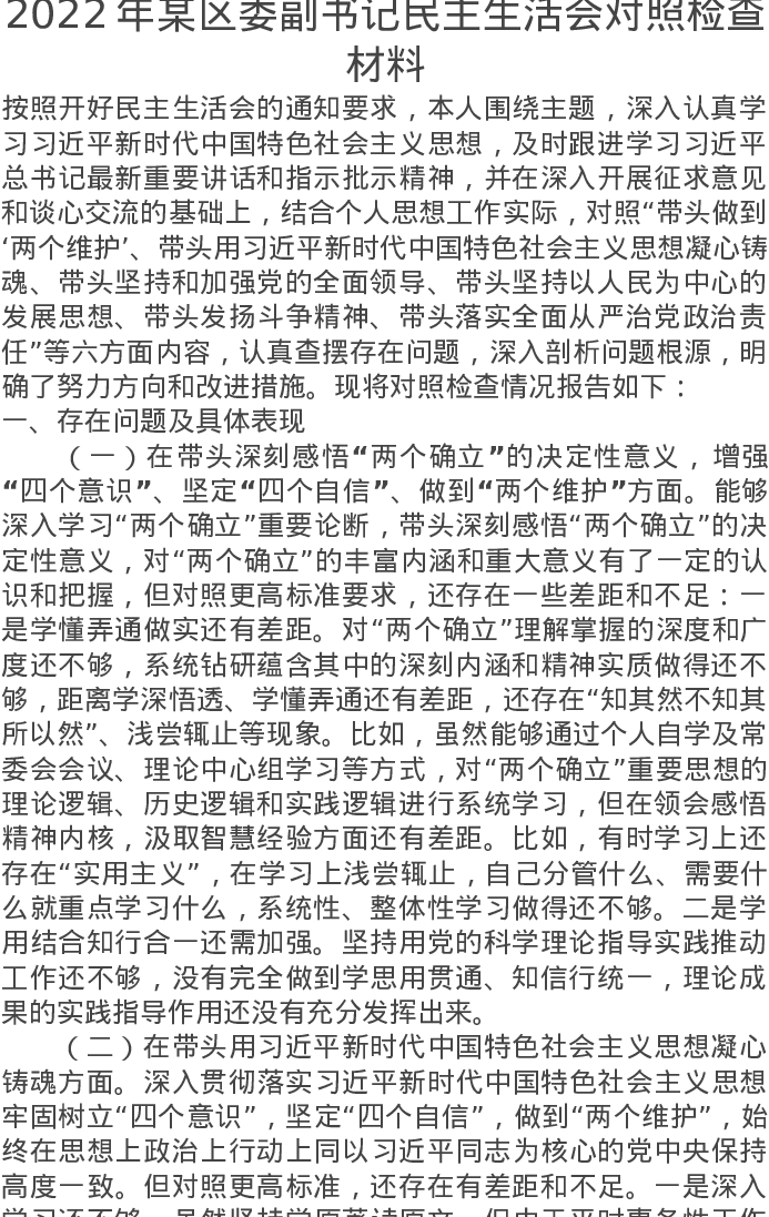 2022年某区委副书记民主生活会对照检查材料(六个带头方面)