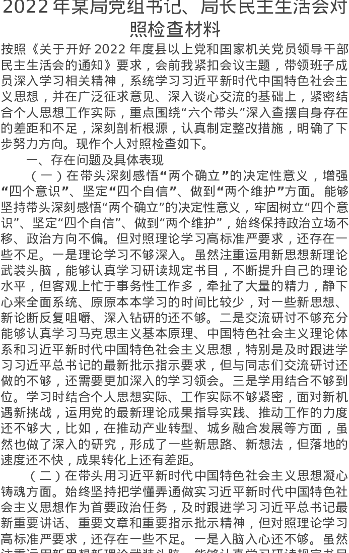 2022年某局党组书记、局长民主生活会对照检查材料(六个带头方面)