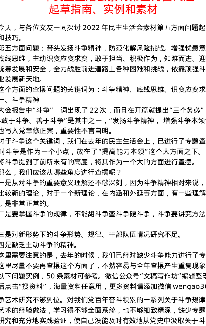2022年民主生活会素材第五方面问题起草指南、实例和素材50条