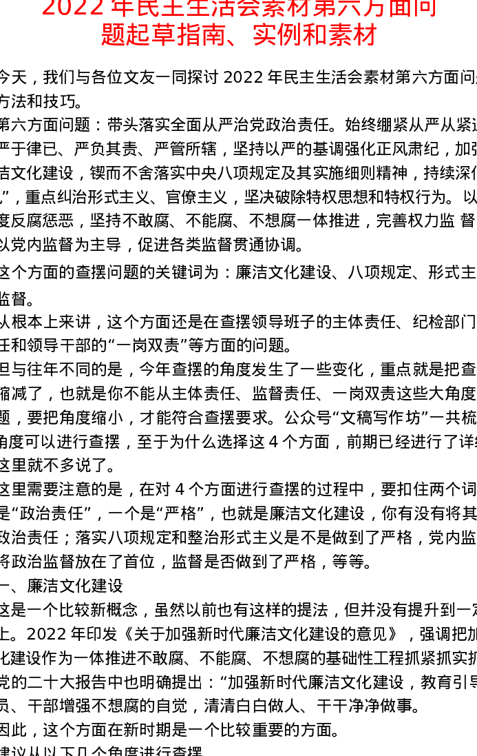 2022年民主生活会素材第六方面问题起草指南、实例、素材91条