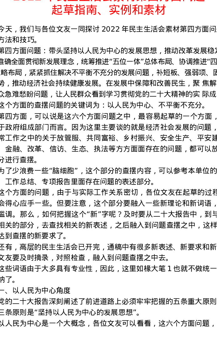 2022年民主生活会素材第四方面问题起草指南、实例和素材49条