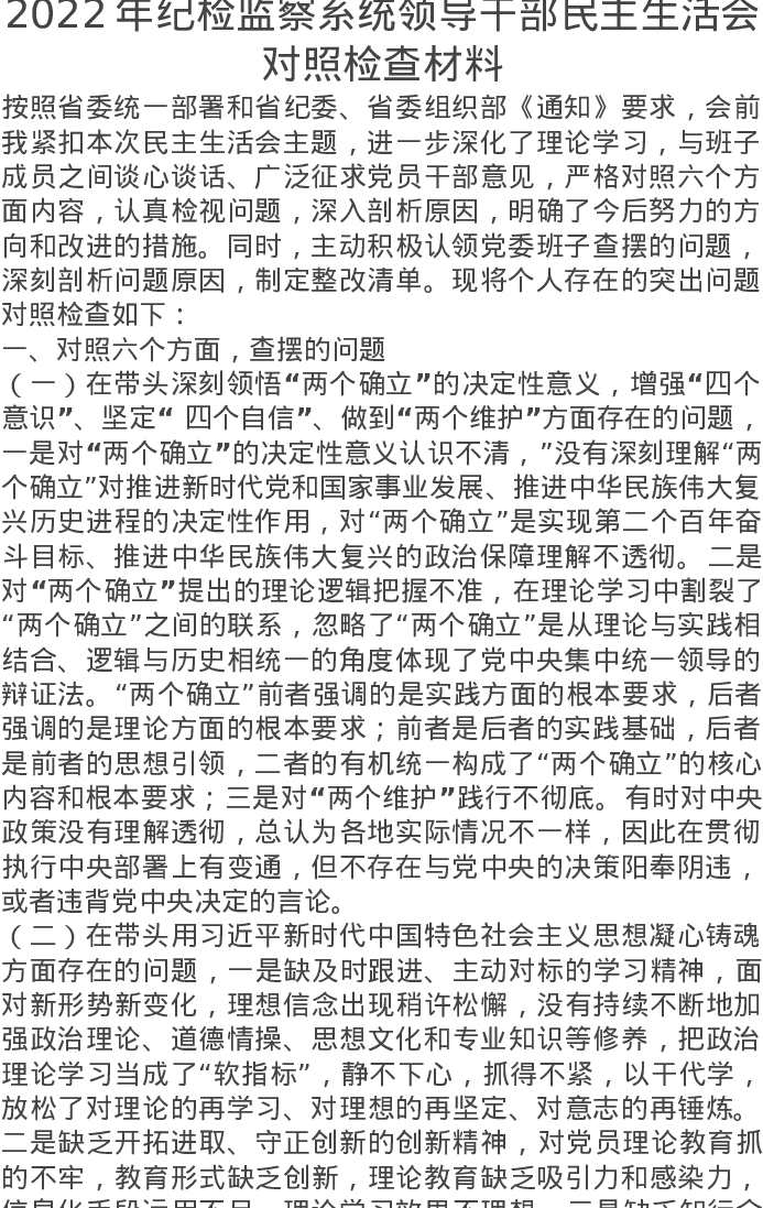2022年纪检监察系统领导干部民主生活会对照检查材料(六个带头方面)