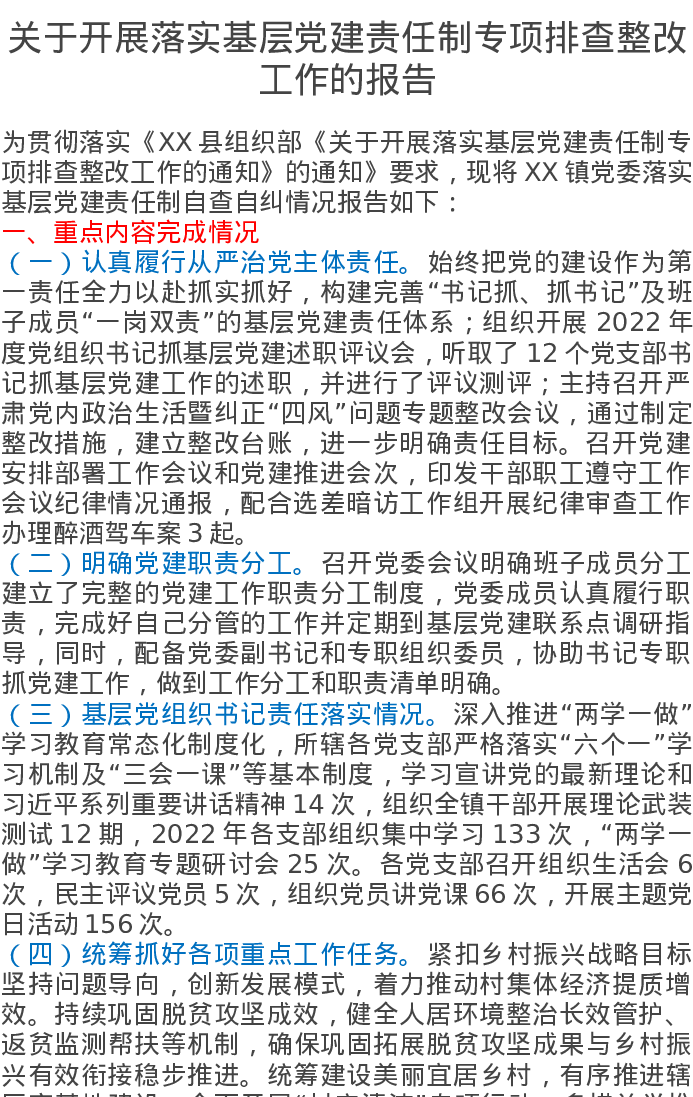 关于开展落实基层党建责任制专项排查整改工作的报告