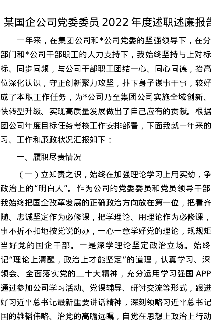 某国企公司党委委员2022年度述职述廉报告