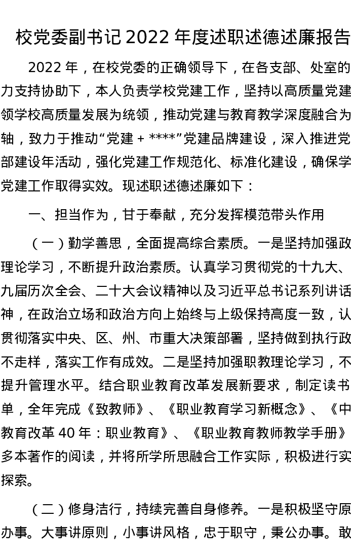 校党委副书记2022年度述职述德述廉报告