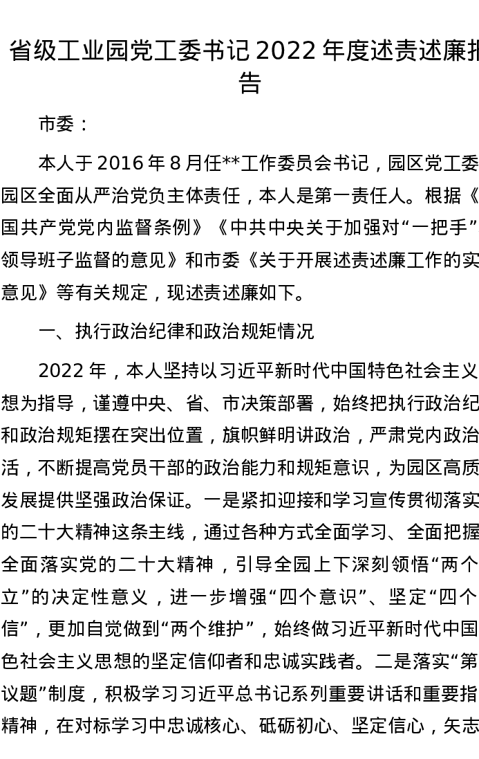 省级工业园党工委书记2022年度述责述廉报告
