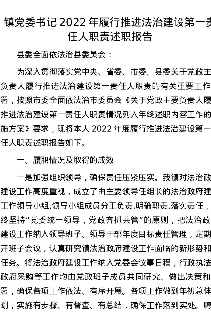 镇党委书记2022年履行推进法治建设第一责任人职责述职报告