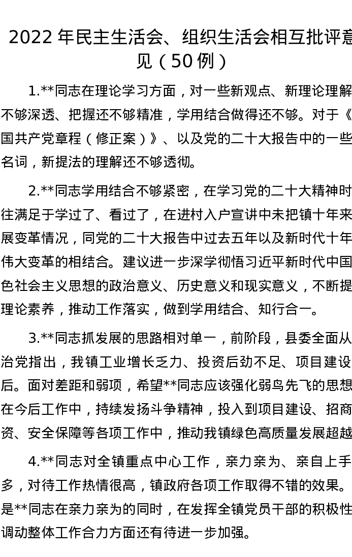 2022年民主生活会、组织生活会相互批评意见(50例)