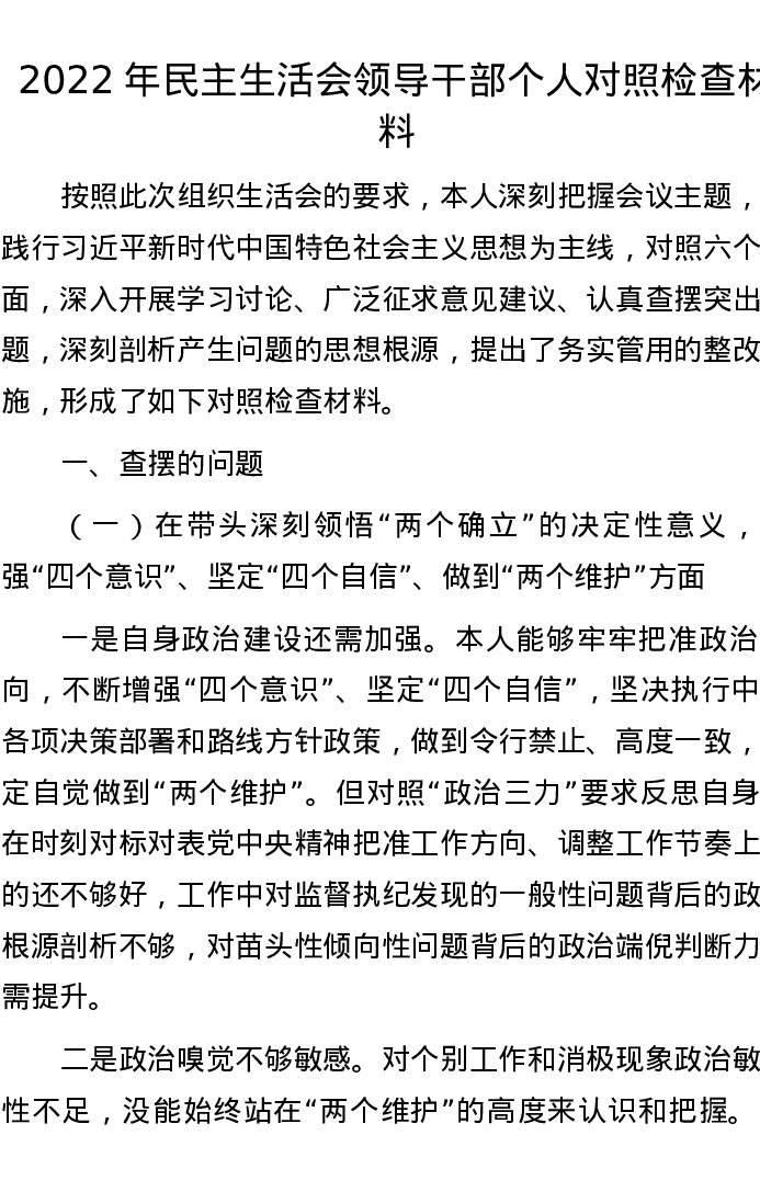 2022年民主生活会领导干部个人对照检查材料