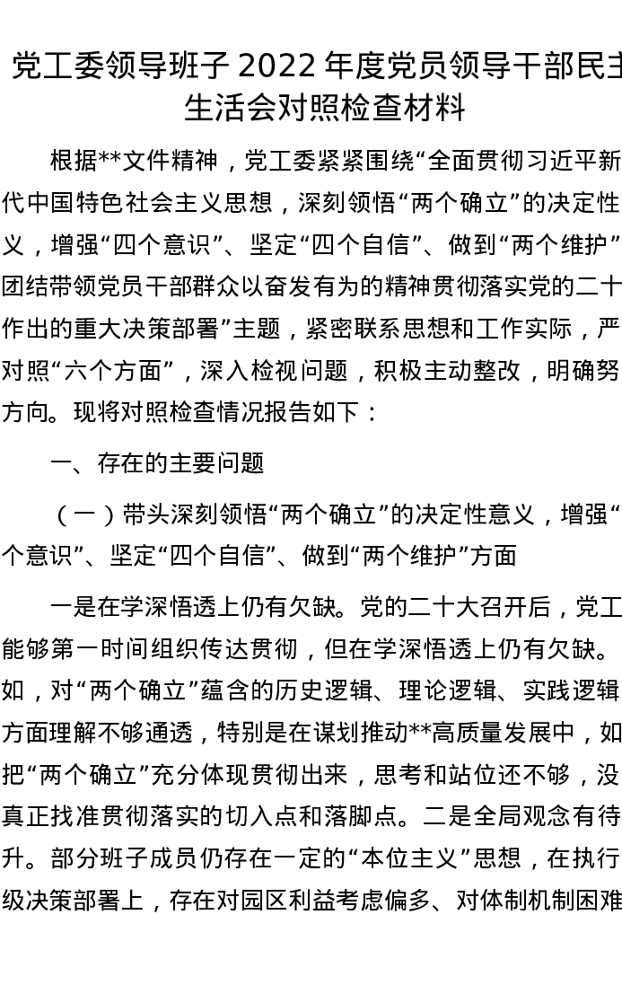 党工委领导班子2022年度党员领导干部民主生活会对照检查材料