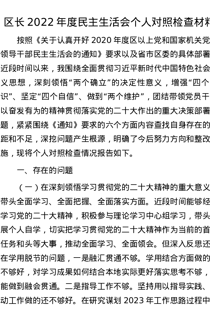 区长2022年度民主生活会个人对照检查材料