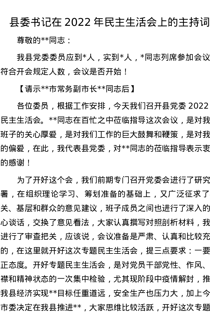 县委书记在2022年民主生活会上的主持词