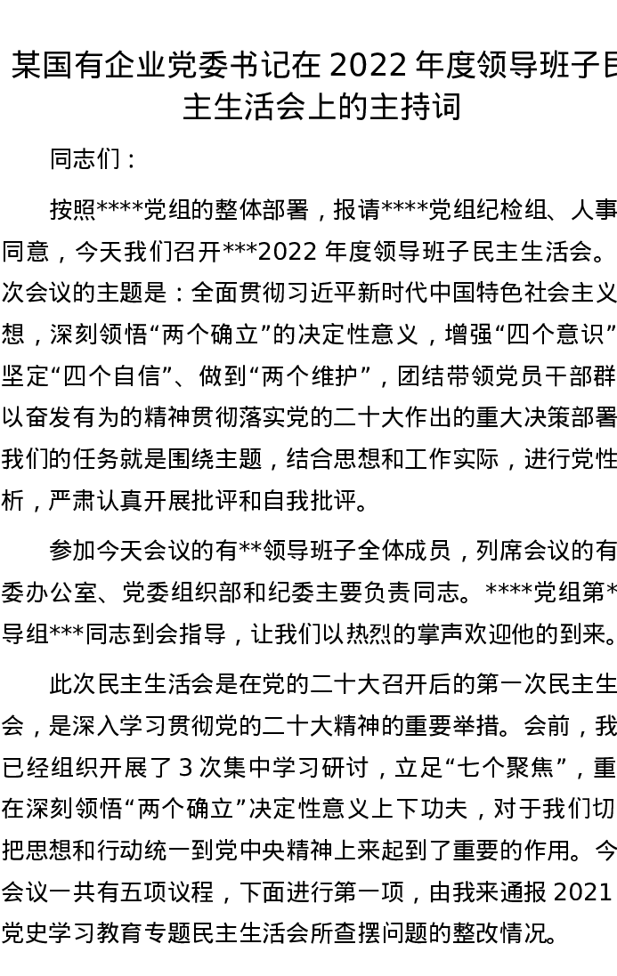 某国有企业党委书记在2022年度领导班子民主生活会上的主持词