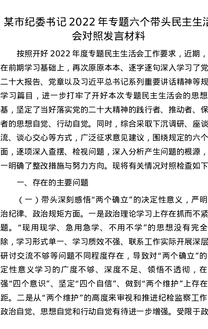 某市纪委书记2022年专题六个带头民主生活会对照发言材料