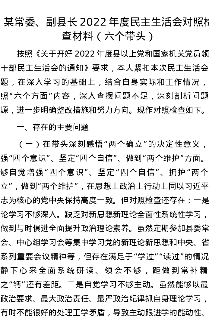 某常委、副县长2022年度民主生活会对照检查材料(六个带头)